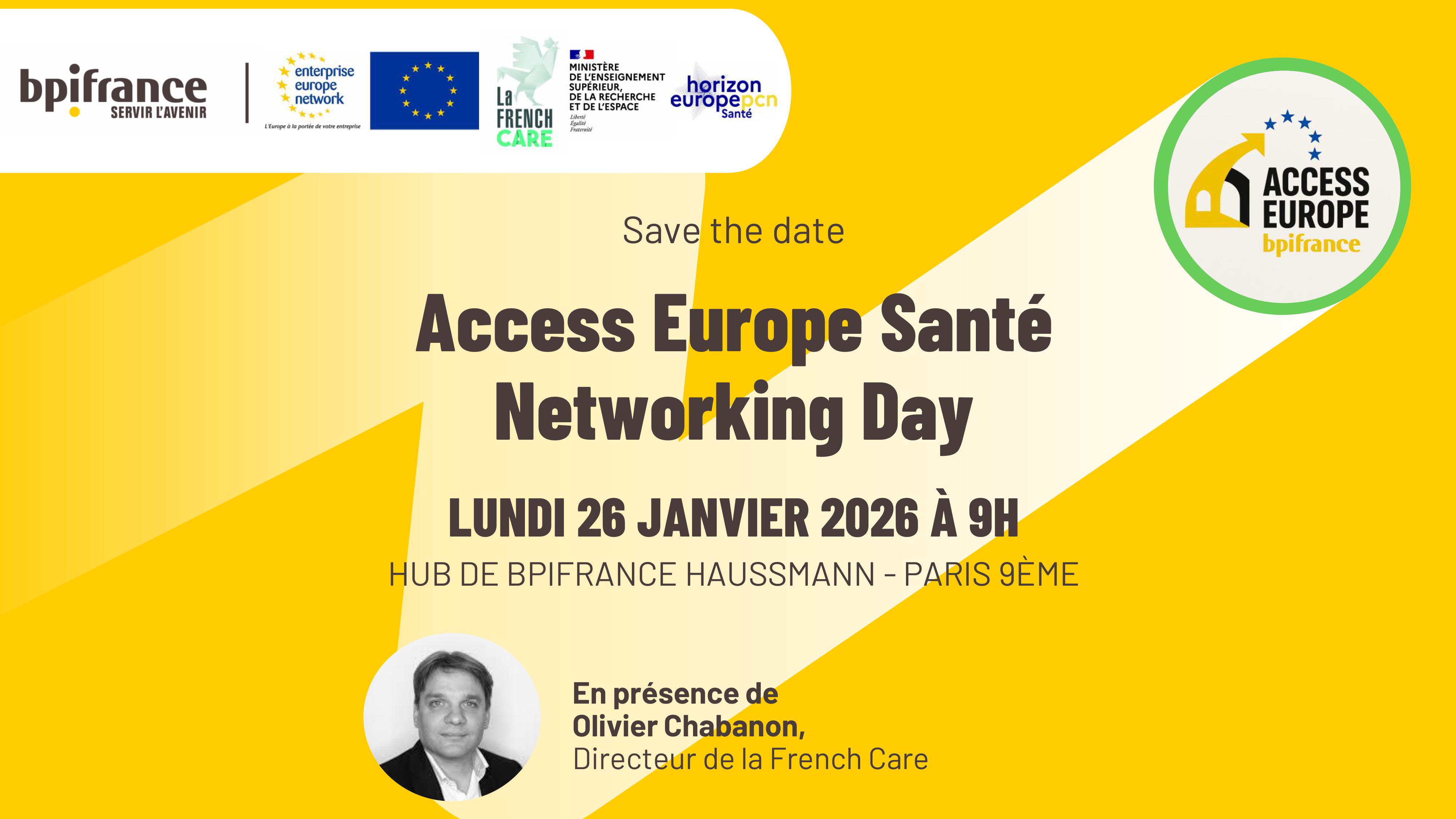 Cet événement réunira les acteurs santé (membres du GTN) et les entreprises innovantes dans le cadre du parcours Access Europe, pour vous présenter les opportunités de financements européens et favoriser les connexions stratégiques. Un mot d’introduction sera prononcé par Olivier Chabanon, Directeur de la French Care.